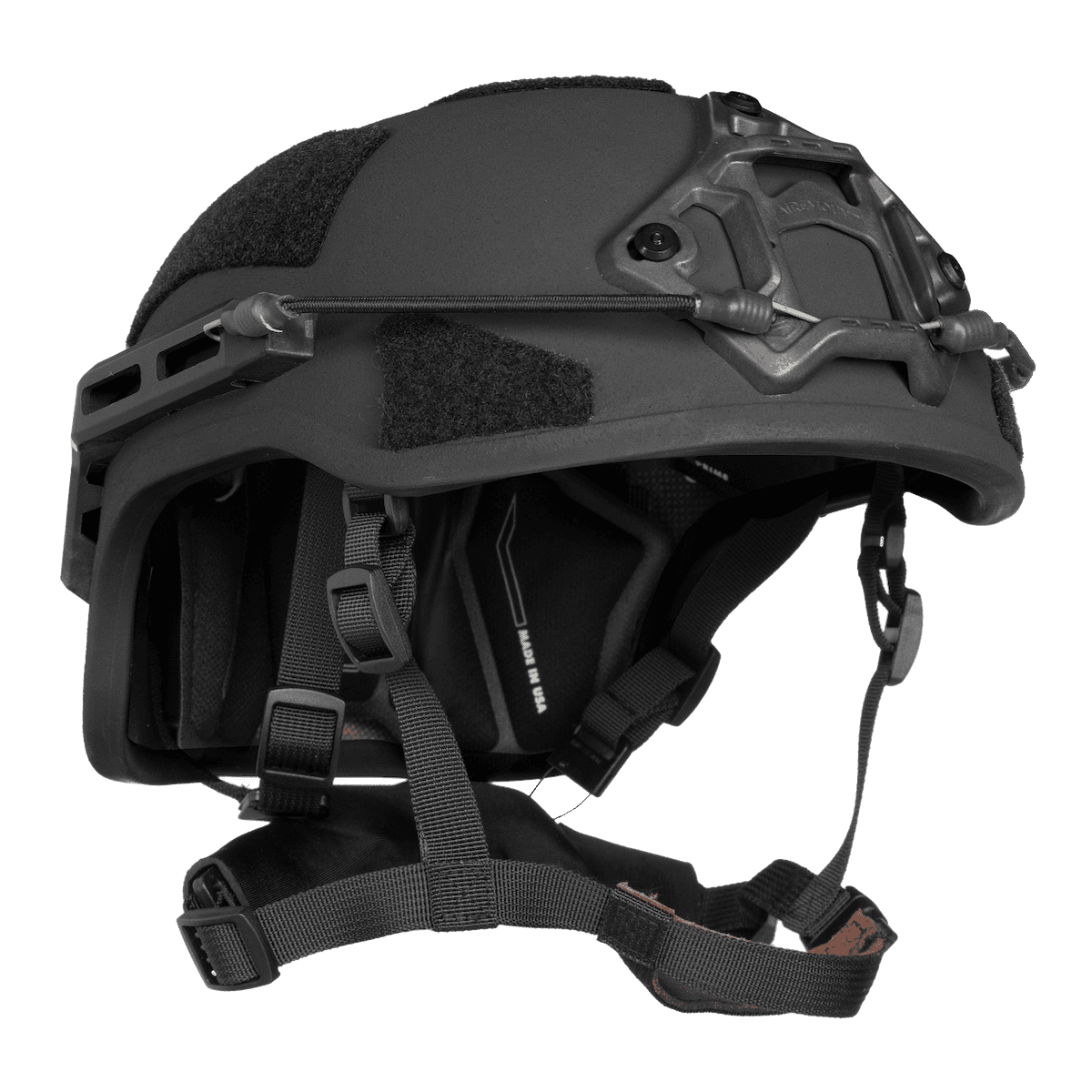 Mounting System: ArmorSource uses their own proprietary AireRail side rail system and AireMount NVG shroud, both attached via their boltless advanced adhesive technology rather than traditional drilled hardware. The AireRail is an M-LOK compatible system that weighs roughly 50 grams versus 135 grams for equivalent traditional rail systems, a significant weight saving at scale. The AireMount is a three-point universal shroud weighing approximately 23 grams, compatible with all common NVG mounts. The fully loaded high-cut Special Command configuration includes AireRail side rails, the AireMount NVG shroud, and an operational loop system. The boltless adhesive attachment across all mounting hardware eliminates the need to drill through the ballistic shell, preserving structural integrity at impact points.